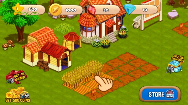 2、呈现出农场场景,有房屋、农田、资源显示、功能按钮(STORE商店等),属于典型的农场经营界面,玩家可进行种植、建设等操作。