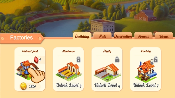 3、实体信息有“Factorie”分类下的“Animalfood”“Henhouse”“Pigsty”“Factory”,还有“Building”“Pets”等分类标签,呈现建筑解锁与等级要求等内容。