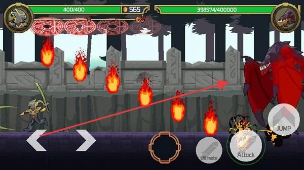 3、战斗中,躲避火焰陷阱,用“Attack”攻击Boss(如红色巨龙),攒能量放“Ultimate”,击败敌人,赢取奖励,解锁新英雄。