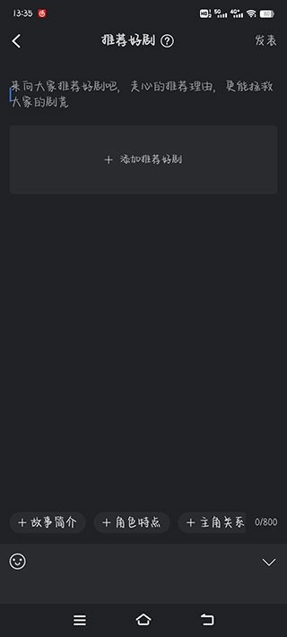 4、如果自己也想发表作品,可以点击“底部的推荐好剧”,进入编辑页面,有故事简介、角色特点、主角关系等选择可以帮你更好的整理思路,写出好的影评获得点赞和支持。
