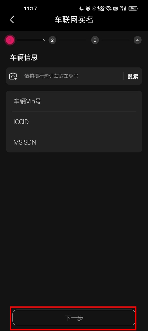 5、然后会进入到车辆信息绑定页面,填写车辆的车架号、车辆vin号、icccid、msisdn等信息之后,点击下一步根据软件的步骤进行认证,最后就可以连接车辆了。