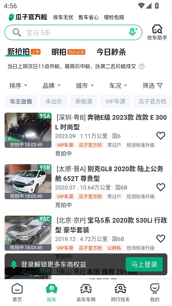 3、在“拍车”界面可以看平台每天上架的新车,也可以选择竞拍自己看中的车。