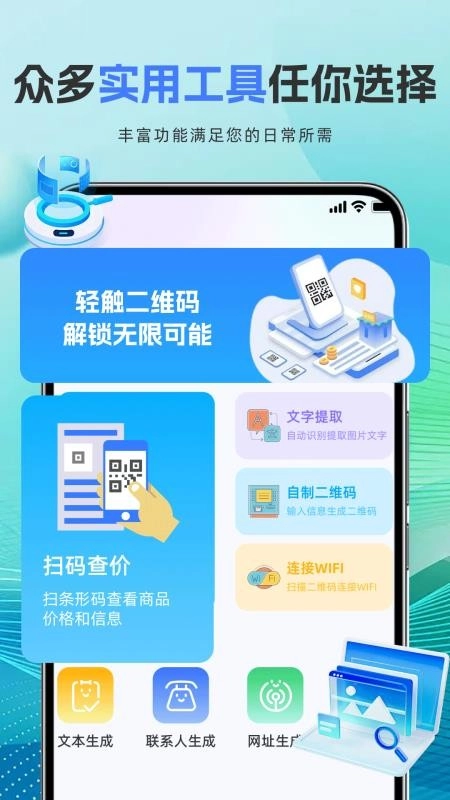 二维码扫扫帮,是一款功能多样的二维码扫描识别工具软件。它包含扫码查价、文字提取、自制二维码、连接WiFi、文本生成、网址生成等众多实用功能,充分满足用户日常所需。用户能随时扫描各类商品的条形码,获取商品价格与详情介绍,快速了解商品价格。同时,软件可对图片中的文字信息进行快速识别提取,助力用户轻松记录文字,为工作提供便利。此外,软件还支持用户自制专属二维码,让二维码制作变得简单便捷。有需求的用户,快来使用二维码扫扫帮软件吧!