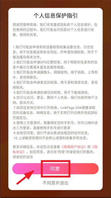 安装并打开荷缘,先同意个人信息保护指引