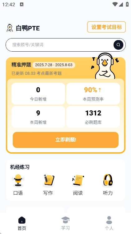 白鸭PTE堪称一款极为出色的学习软件,宛如全球PTE考生亲密无间的学习伙伴。它具备AI模考功能,能够高度精准地模拟考试场景,让考生提前适应真实考试氛围。不仅如此,软件内拥有超全面的题库,各类题型均被涵盖其中,有力地辅助考生通过刷题实现能力提升。与此同时,白鸭PTE还能依据考生需求,定制个性化学习计划,助力考生高效备考。无论考生的目标是留学深造、移民定居,亦或是职业发展,白鸭PTE都能提供精准有效的帮助,让备考过程变得更为轻松,使考生距离自己的目标更进一步。