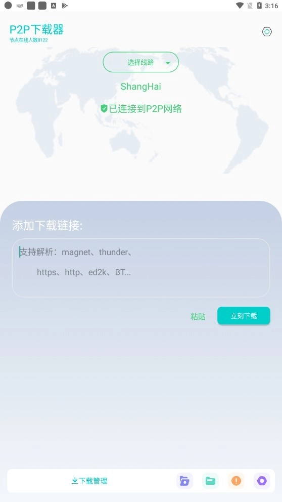 2、打开软件后首页默认为「」板块,可直接在这新建任务,支持「FTP、HTTP、magnet、ed2k」等多种形式的文件。