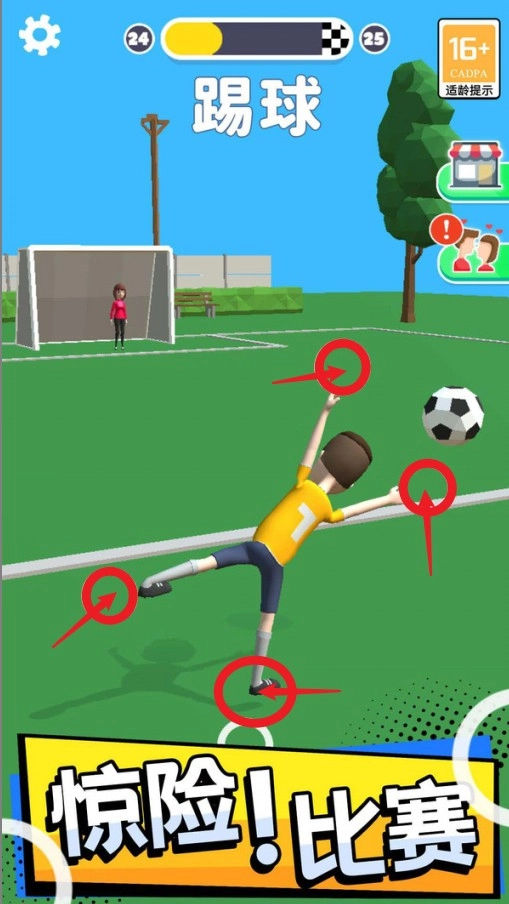 2.足球关卡中需调整角色四肢方向,让角色踢中目标区域达成动作评分。