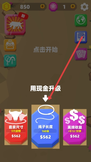 3、返回主界面,用现金(850)升级“绳子长度”(562金币),提升套索距离,优化抓动物效率。