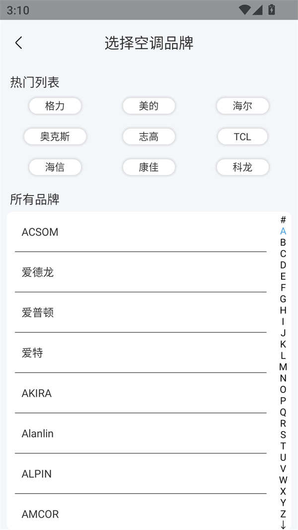 3、在首页选择需要遥控的家电,这里选择的是空调,选好与家中空调对应的品牌。