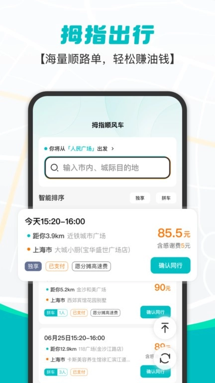 拇指出行,堪称顺风车车主的出行利器!这里订单海量,抽佣超低,更有专业的车主认证,时刻为出行安全保驾护航。不仅如此,乘客与司机朋友的权益都能得到全方位保障,还有丰富的出行补贴福利。别再犹豫,快来加入我们,即刻点击,开启便捷出行之旅!