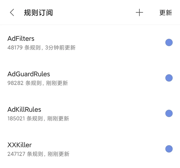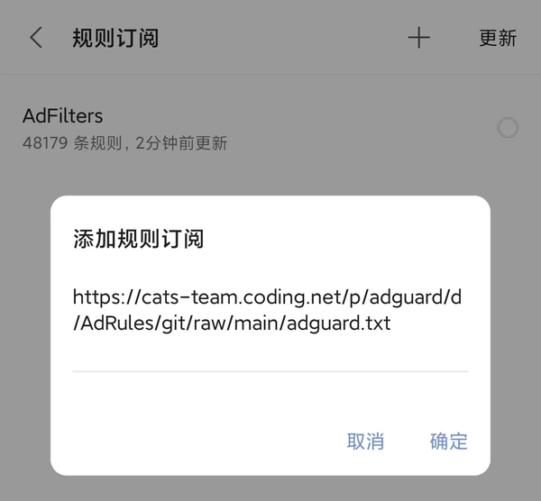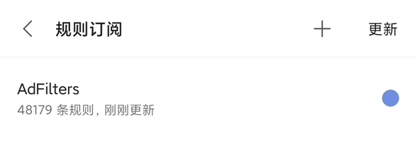 到设置里面点击更新即可,现在自带的拦截规则已经有48179条,四万条?远远不够!文末的订阅源了解一下,直接添加地址导入。