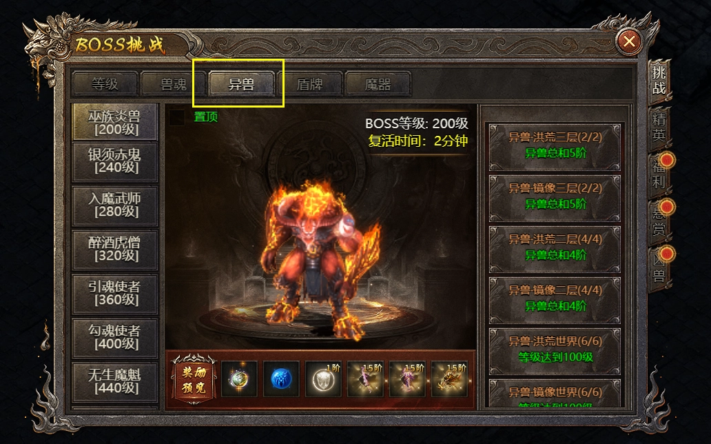 1. 巫族炎兽、无生魔魁等不同等级的 BOSS 出现刷新,会掉落兽魂、盾牌这类稀有道具。