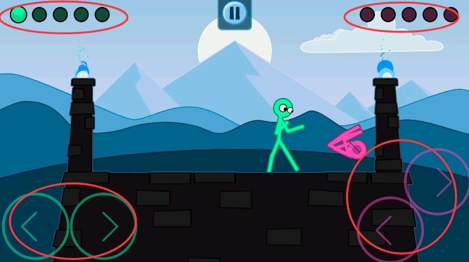 2、对战界面顶部显示五个计分圆点,每次击倒对手点亮一个圆点,底部设有前进攻击和后退防御两个操作按键。