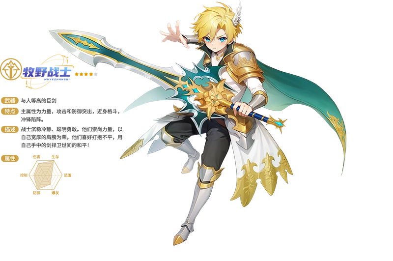 描述:战士沉稳冷静、聪明勇敢。他们崇尚力量,以自己宽厚的肩膀为荣。他们喜好打抱不平,用自己手中的剑捍卫世间的和平!