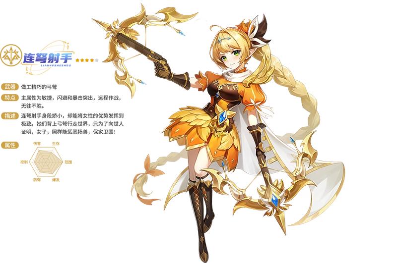描述:连弩射手身段娇小,却能将女性的优势发挥到极致。她们背上弓驽行走世界,只为了向世人证明,女子,照样能惩恶扬善,保家卫国!
