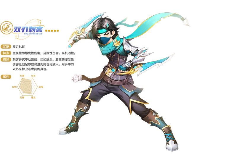 描述:刺客讲究不动则已,动如脱兔,超高的爆发性伤害让他足够应付遇到的任何敌人,用手中的双匕来捍卫者世间的真理。