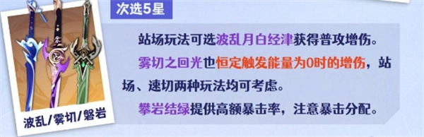波乱月白经津:副词条提供暴击伤害,武器特效提升普攻伤害,适合站场普攻流玩法,在普攻频率高的循环中表现优秀,但需注意与圣遗物的暴击属性配比。