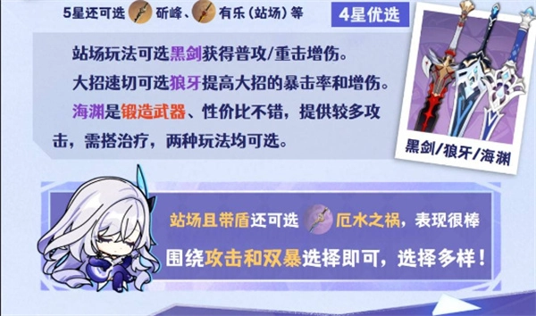 2、四星武器中黑剑性价比极高,提供暴击伤害与生命回复;狼牙适合速切流,通过战技与大招触发增伤;海渊终曲攻高触发方便,适合大多数输出场景。