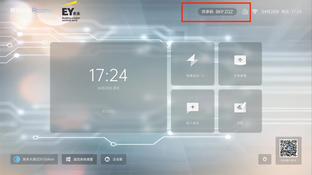4、共享码为Rooms主页面右上角共享屏幕码。