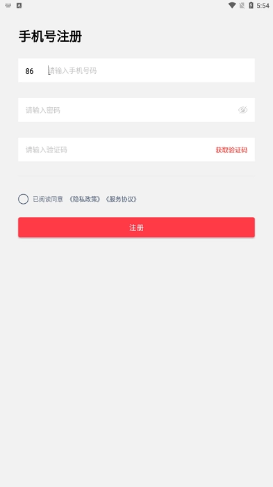 3、输入手机号,设置一个密码,点击获取验证码,填写验证码,勾选已阅读同意 《隐私政策》《服务协议》,点击注册,注册后即可登录使用啦!
