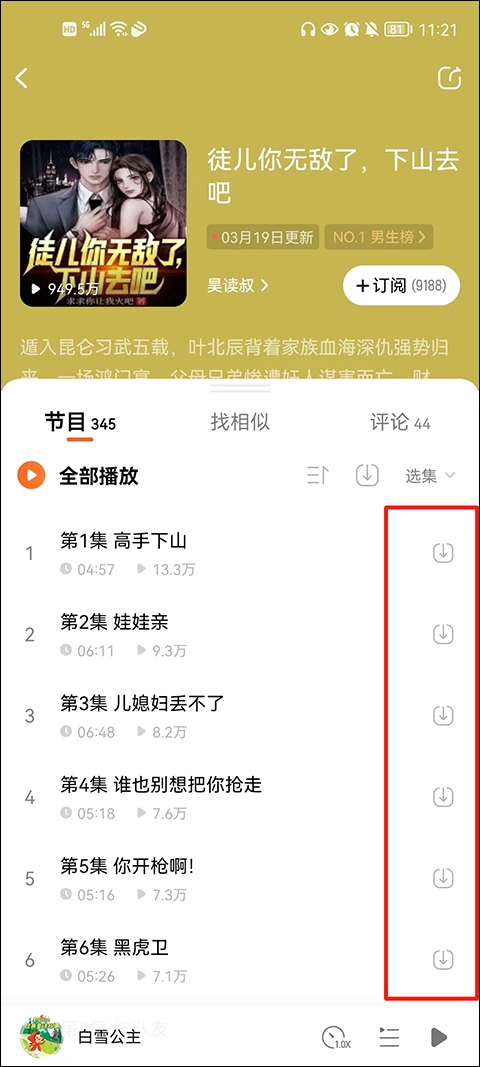 4、点击章节可以进入听书,超多有声小说在线免费听,包括你可以选择定时关闭按钮,可以开启定时模式,睡前听书也能更自由,还可以按照自己的需求,设置语速设置,开启倍速听书,更是可以开启蝰蛇音效,听书效果没得说。