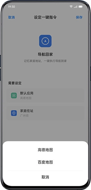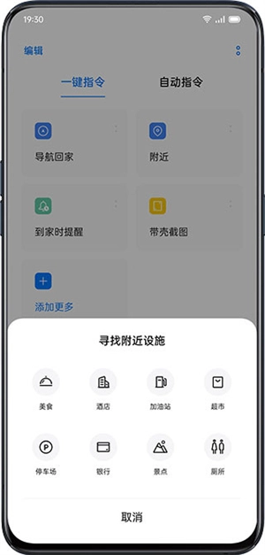 2、进入首页,可以看到一键指令,可以设置「导航回家」、「附近」、「到家时提醒」、「带壳截图」等一键指令。