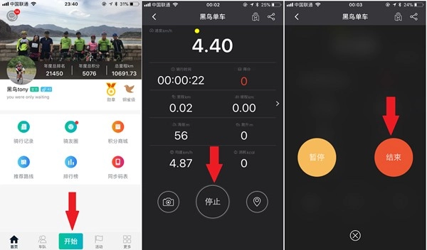 点击下方圆形的“停止”按钮,会出现两个圆形按钮“暂停”和“结束”,点“结束”数据会自动上传云端。并可以在骑行记录中看到了,点“暂停”进入手工暂停状态,继续记录需要点击下方圆形的“继续”按钮