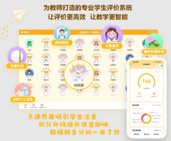 【课堂管理】记录日常行为表现,形成规范引导;实时统计分析数据,成长一目了然;趣味奖品积分兑换,明确奖惩制度。