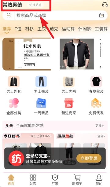 打开纺支宝,进入首页后点击左上角切换站点按钮