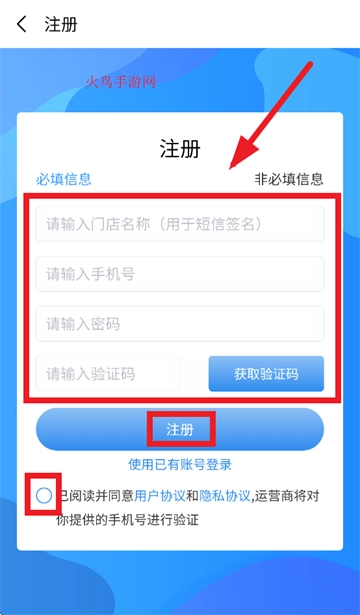 进入注册界面后,输入门店名称,手机号,密码,验证码,勾选已阅读并同意用户协议和隐私协议,运营商将对你提供的手机号进行验证,点击注册即可
