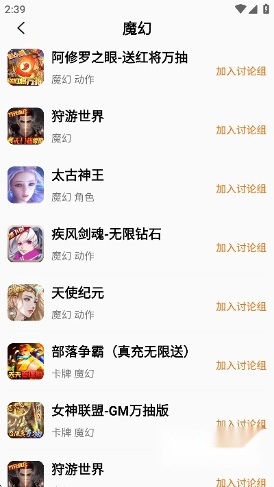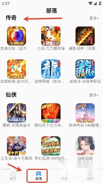 用户们也可以在部落页面根据游戏类型筛选出自己喜欢的游戏,有传奇类,仙侠类,卡牌类等