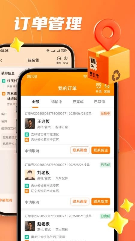 支持用户对自己的订单来实时管理,查看详细的订单信息,更好的联系货主。