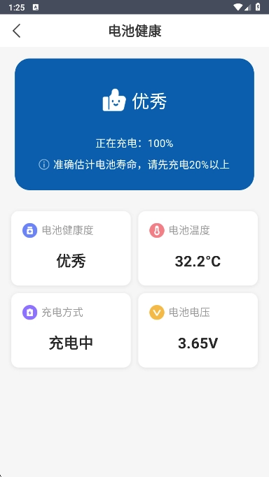 3、检测速度非常快,检测完毕后可以查看电池温度、电池健康度和充电方式