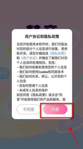 第一次进入软件一定要先看看用户协议和隐私政策,点同意继续下一步。