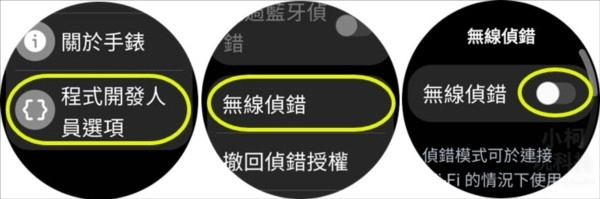 双击双击返回键后,就可以看到关于手表下多了一个程序开发人员选项的选项点下去,选择无线调试,接下来再开启无线调试(此时手表会自动打开 Wi-Fi功能)。