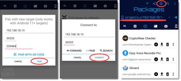 请依手表上出现的配对码输入;再按 PAIR →此时再对照一下手表及手机上的 Port号是否相同,再按 Connect 。只要看到中间的蓝子字串上出现 192.168开头的数字即代表已连线成功。若要传送 APK到手表上,请按屏幕顶端的+图案。