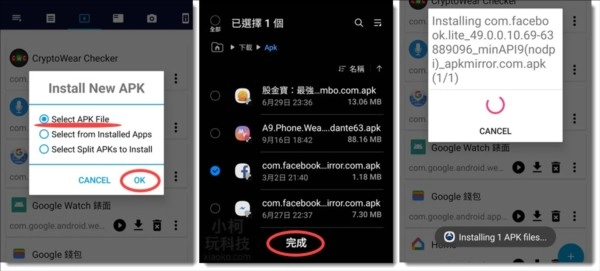 选择 Select APK file (也就是选择 APK文件)按OK →接下来请在手机的文件夹中找到要上传到手表的 APK文件 →手机就会开始传送 APK文件。