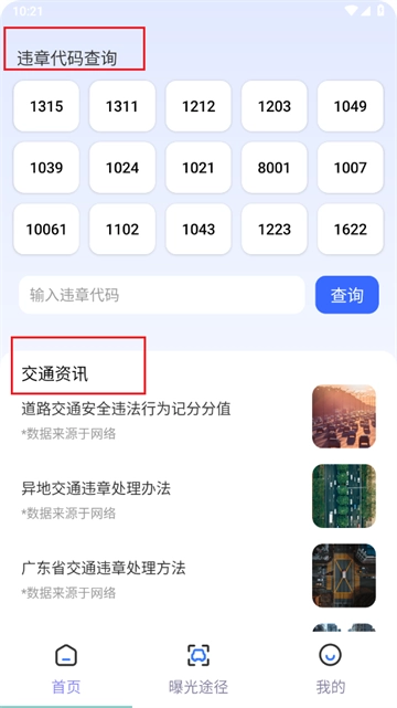 2、进入到软件首页,这里提供了违章代码查询功能和交通资讯等内容。