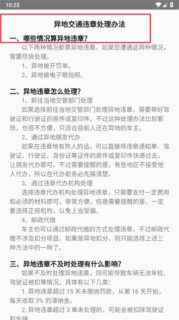 4、而在交通资讯中大家可以查看到关于各个方面的交通违规现象以及处理办法,例如【异地交通违章处理办法】