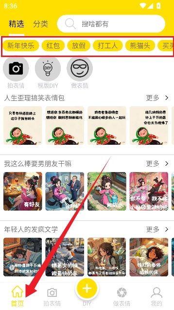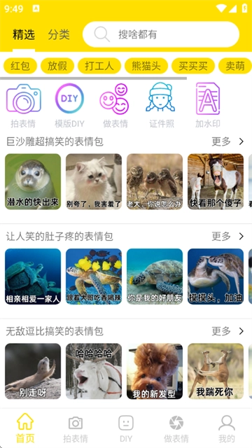 2、进入到软件首页,如图所示。这里提供了大量的表情包资源,同时还支持拍表情,做表情。
