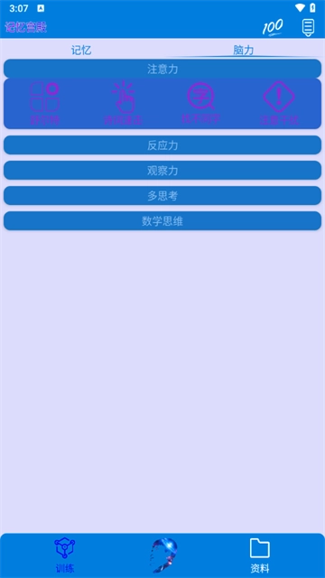 2、针对不同需求设置训练组别,将训练模式细分为记忆竞赛、脑力竞技和综合记忆部分。