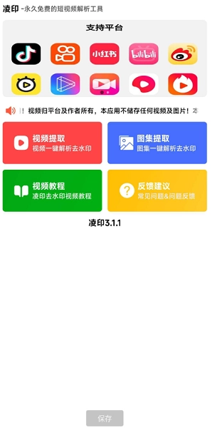 软件名称为新凌印,这是一款专业的短视频(含图集)解析软件,支持众多平台,像广为人知的抖音、快手、微博、西瓜视频、B站、小红书等等。