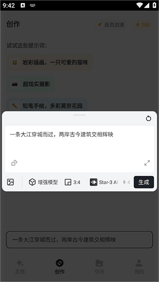 2、然后给ai输入提示词,例如:一条大江穿城而过,多个提示词有逗号隔开,接着点击【生成】