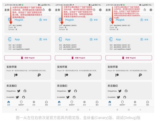 有些小白忘性大,设置里“隐藏Magisk应用”改了面具名称,第二天都忘了自己的面具版本。而且这种情况并不罕见,所以依靠“图标为脸谱、应用名称为Magisk”这个判断方法有一定的局限性。所以接下来,我教大家通过面具主页来判断面具版本。以下图一的面具主页均是面具的,从左往右依次是稳定版、金丝雀(Canary)版、调试(Debug)版。