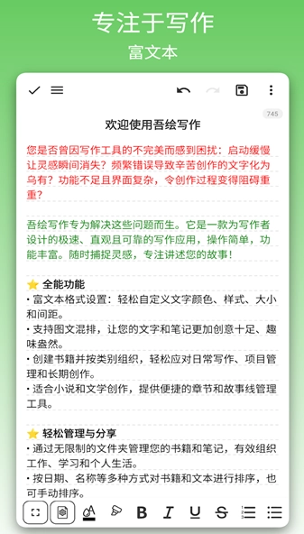吾绘写作手机版,作为一款智能生成创作工具,集写作过程所需的众多功能于一身。从基础的文字编辑,到文件管理,再到离线写作以及多设备同步,全方位满足用户在各类场景下的写作需求。用户还能自由定制专属的创作习惯,随心设置多种创作背景,从而更轻松地沉浸于创作,随时抓住稍纵即逝的灵感。