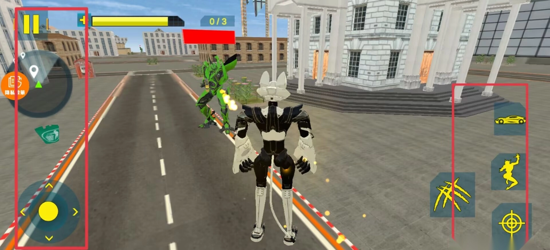 3、游戏过程中左侧显示暂停功能、生命值状态及移动操控区域,右侧配置变形、攻击等动作指令按键。