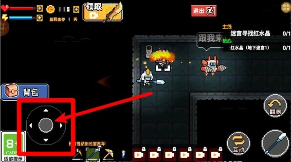 3. 地牢战斗行动指示:通过左侧虚拟方向摇杆操控角色移动,于黑暗迷宫里寻觅目标,并展开攻击与探索。