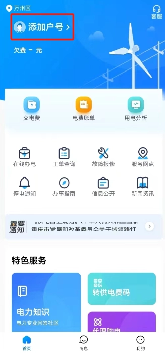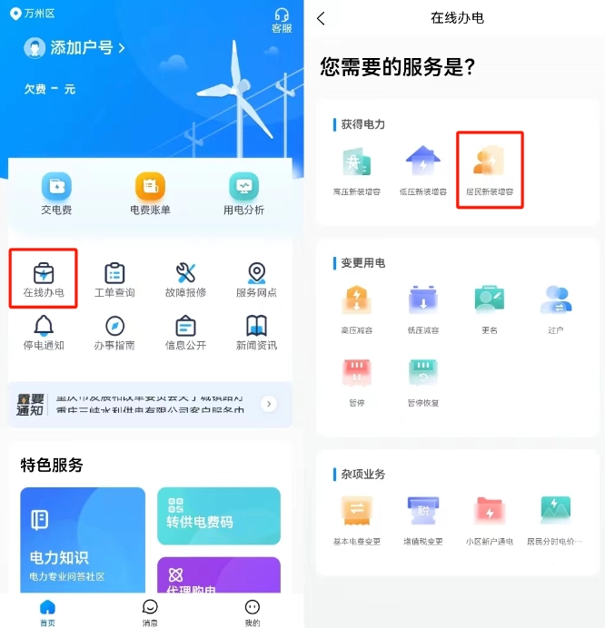 登录完成好后,点击首页的“在线办电”选择“居民新装增容”