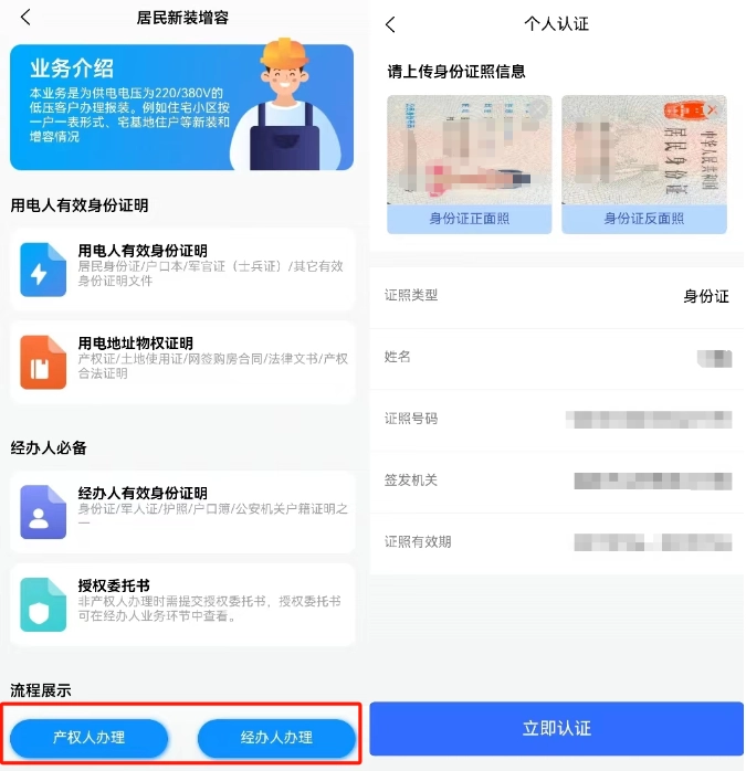 点击下方的“产权人办理”或“经办人办理”一般会要求进行“个人认证”需要上传身份证正反面照片