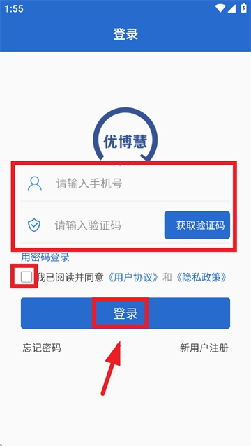 进入登录界面后,输入手机号,验证码,勾选我已阅读并同意 《用户协议》 和 《隐私政策》,点击登录即可